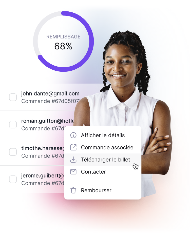 Gain de tempsAutomatisez vos tâches (relances mails, suivi des ventes) et concentrez-vous sur l’essentiel : votre événement.