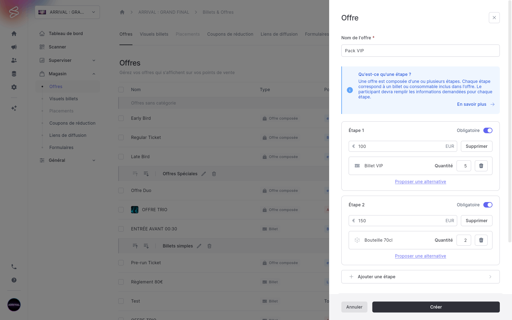 Offres groupées sur-mesureProposez des packs avantageux, des billets couplés ou des options payantes pour optimiser vos ventes, tout en profitant d'une flexibilité totale sur la configuration des tarifs.