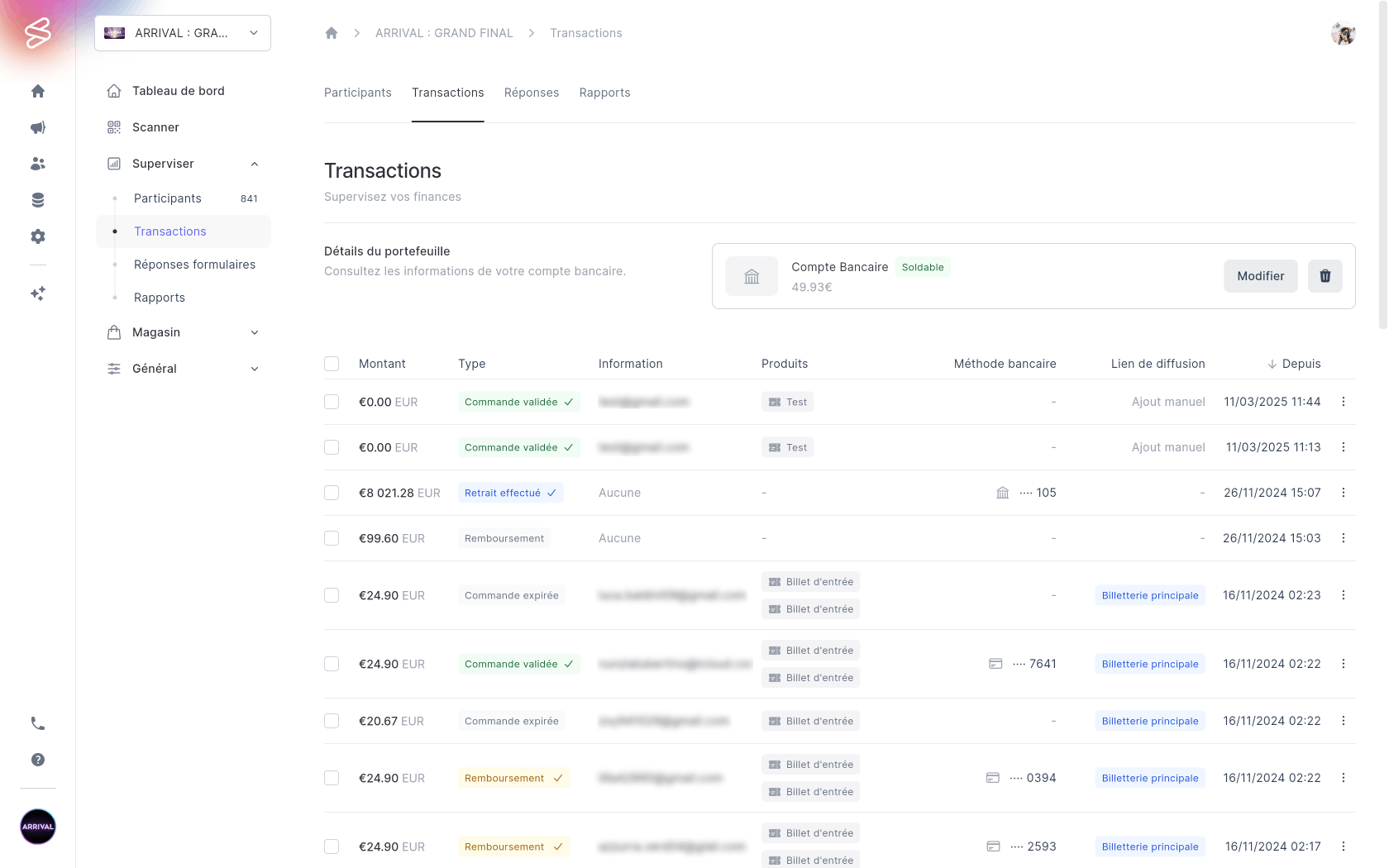 Prenez le contrôle total de votre billetterie grâce à notre interface intuitive. Ajustez vos ventes, traitez les remboursements et accédez à vos statistiques en temps réel, sans dépendre d’un intermédiaire. Optimisez vos processus et simplifiez votre gestion au quotidien.